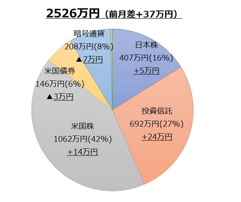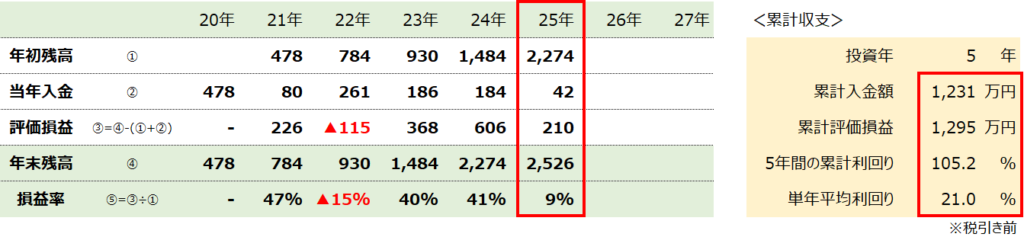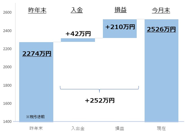 (昨年末からの入金総額:+42万円、昨年末からの評価損益:+210万円)
