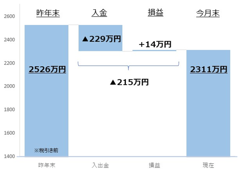 (昨年末からの入金総額:▲215万円、昨年末からの評価損益:+14万円)